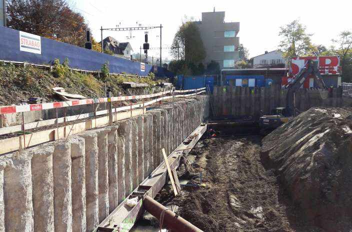 Aufgrund der Nähe der tiefen Baugrube zur SBB-Gleisanlage wurde eine automatische Messanlage aufgezogen. Neben dem geodätischen Monitoring der SBB Gleise werden parallel die Inklinometer- und Piezometermessungen automatisch gemessen und realtime visualisiert und alarmiert.